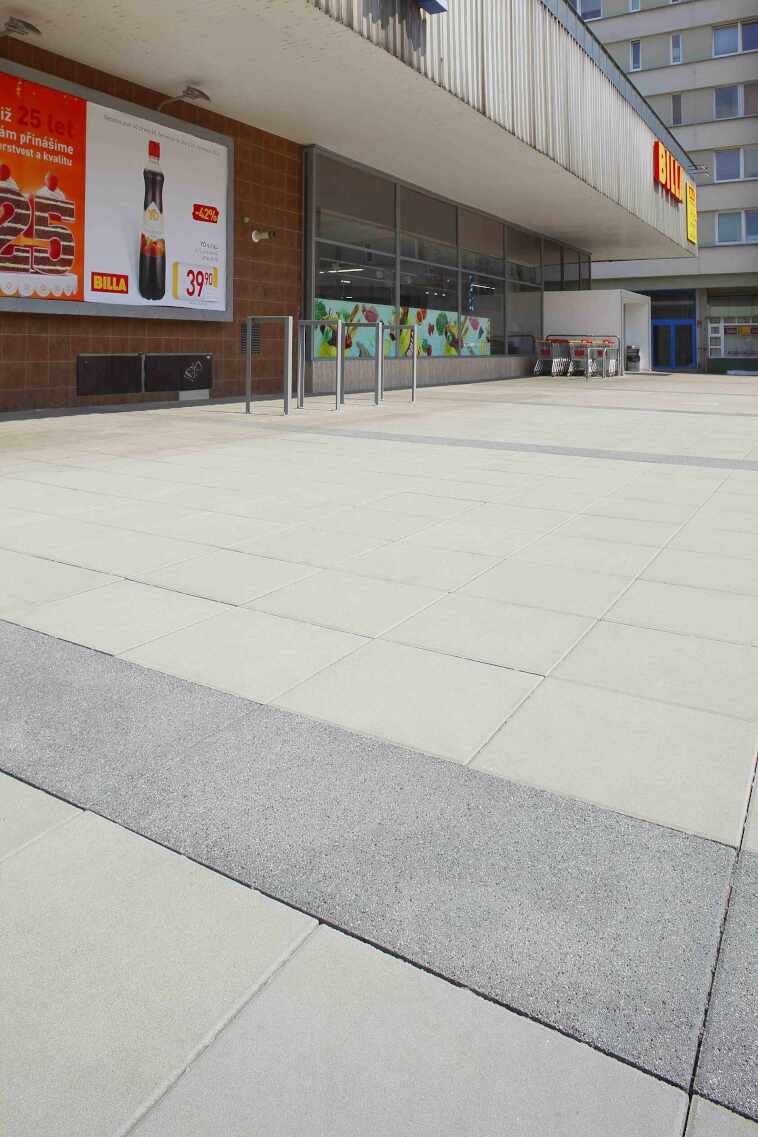Velký formát betonové dlažby je hit posledních let. Využití takové dlažby najdete na veřejných prostranstvích i u rodinných domů. Stále častěji je vyhledávaný velký rozměr s jednoduchým povrchem, který dokonale dotvoří moderní budovy ve funkcionalistickém stylu.