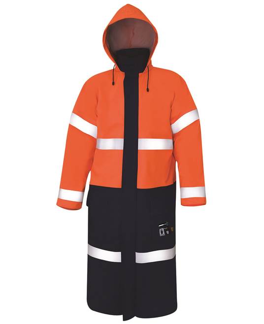 • ochranný kabát delšího rovného střihu s kapucí, kapuci lze složit do límce